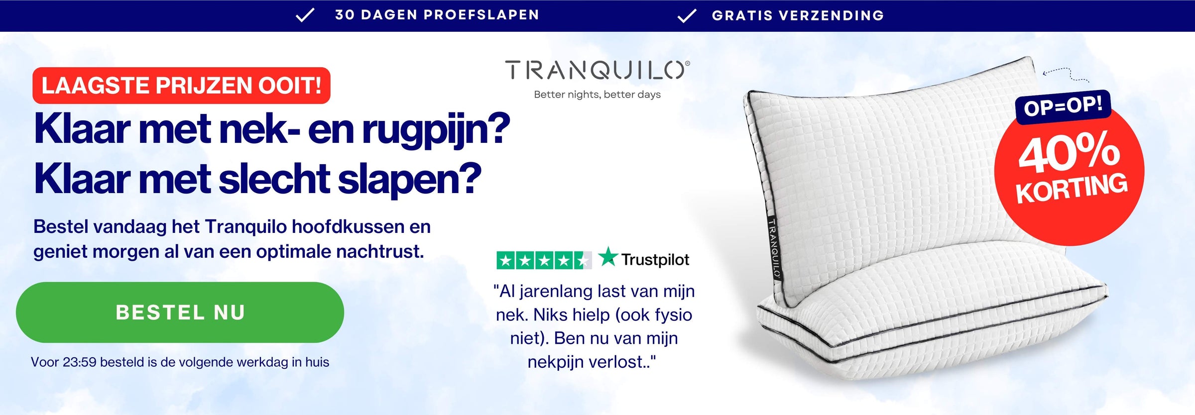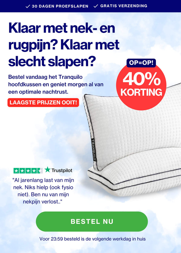 Een risicovrije proefperiode van 30 nachten. Wij weten bijna zeker dat je verliefd wordt op het Tranquilo hoofdkussen. Toch niet tevreden? Retourneer het en ontvang een volledige terugbetaling.